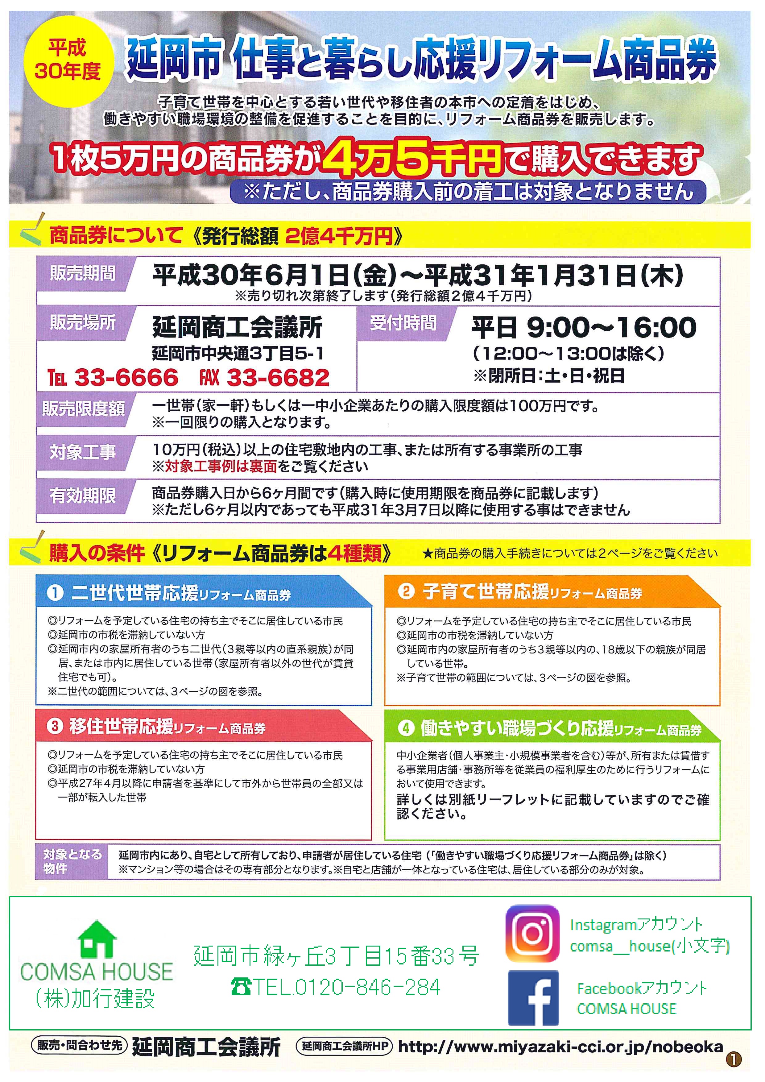 平成30年度 延岡市 仕事と暮らし応援リフォーム商品券 の販売が決まりました。