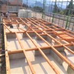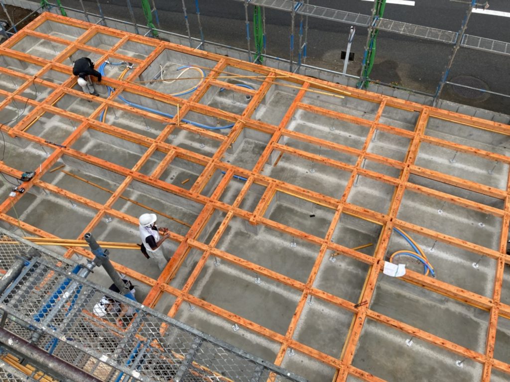 土台敷きとは、基礎コンクリートの上に土台や大引(おおびき)を設置していく作業です。 ちなみに土台とは基礎の上に設置固定する木材のことで、大引とはその土台と土台を繋ぐ木材のことです。