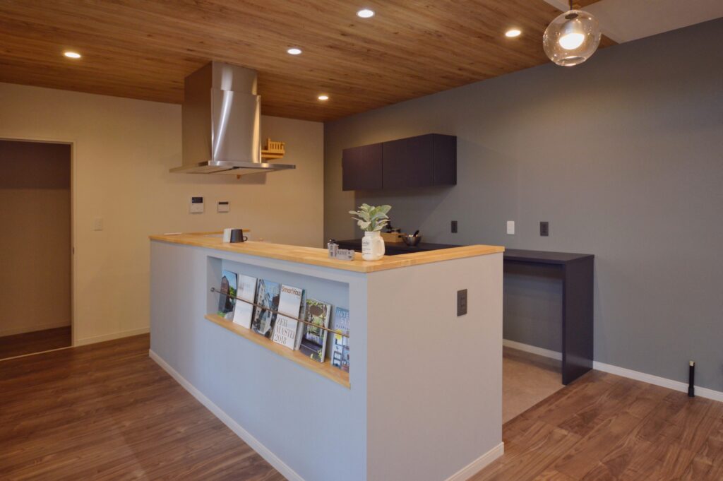 勾配天井で開放感を感じます。木をたくさん使用し、温かみある空間に。