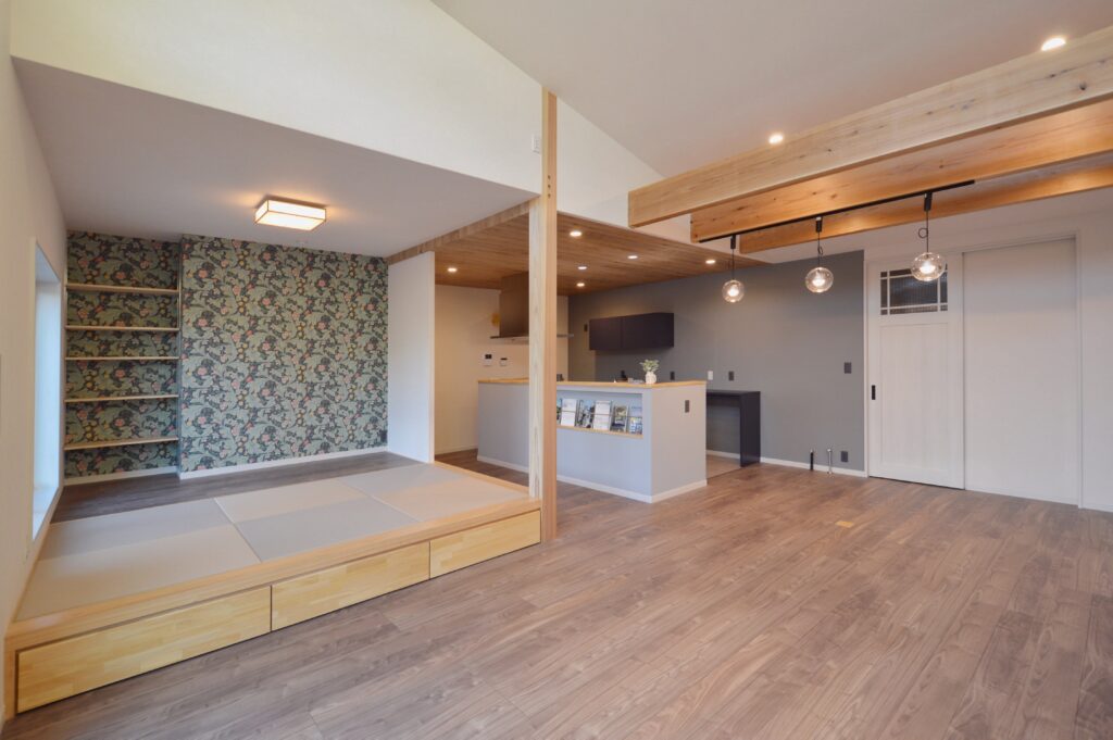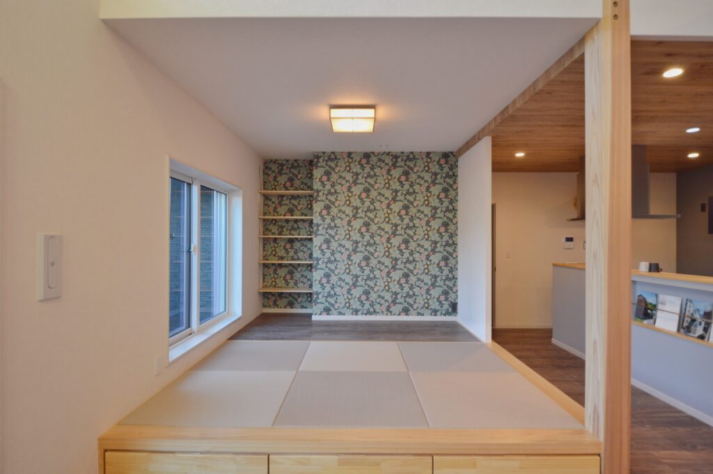 小上がりの畳コーナーは、ウィリアム・モリスのクロスをアクセントに。