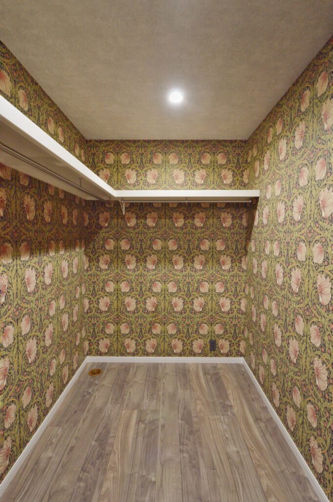 こちらは全面にウィリアム・モリスのクロスを使用し、高級感あるクローゼットに。